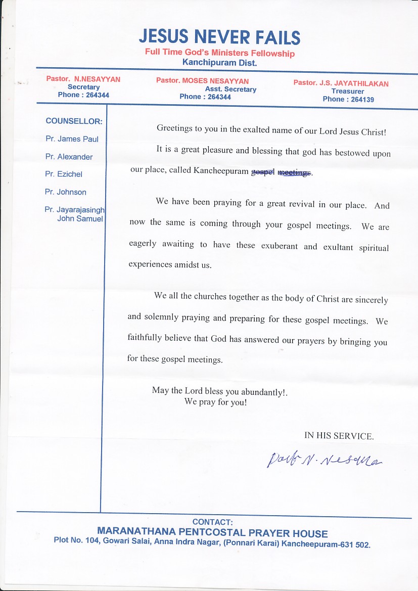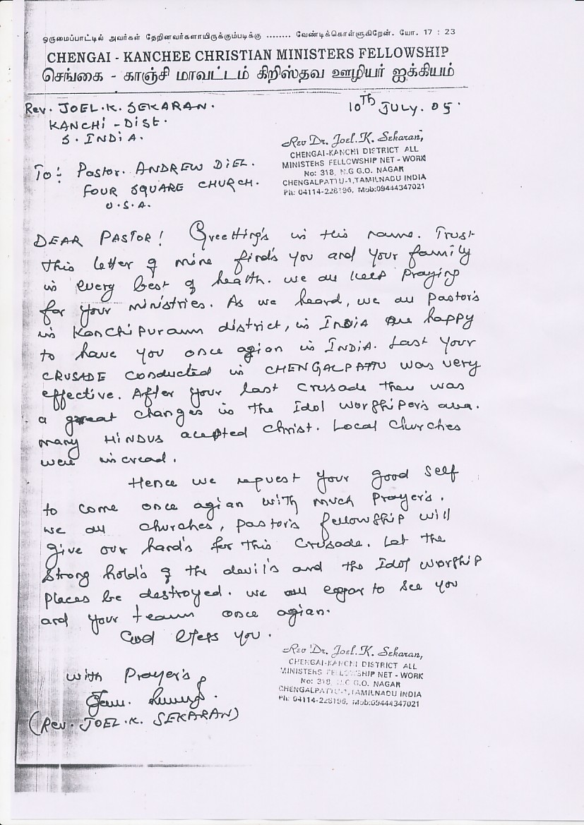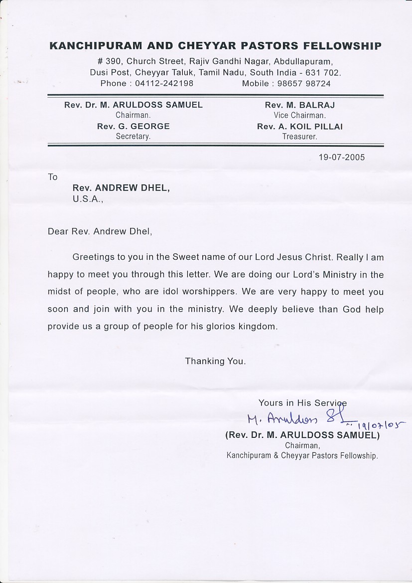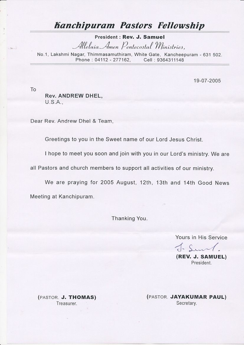 Letters from Local Leadership July 25, 2005 The crusade is being organized by the following local Pastors in Kanchipuram, and I want all who visit to get to know them and their testimonies with us. ← Back to archive